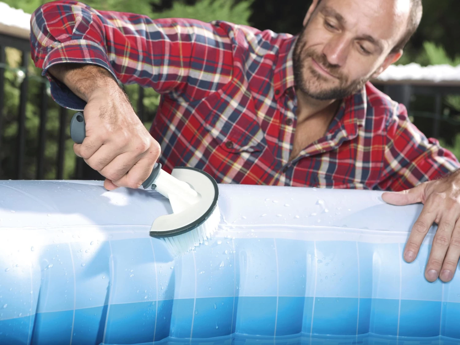 • Brush bumper and nylon bristles protect spa’s surface