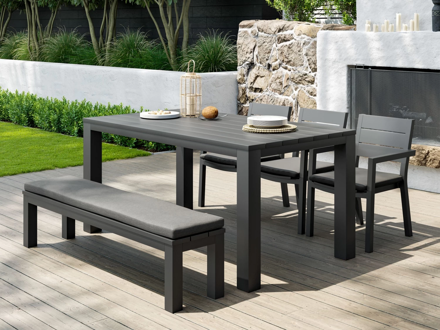 Both the chairs & dining bench are topped with 4cm thick cushions that not only look great, but provide added comfort when dining. Covered with weather resistant Olefin fabric, they’ll handle plenty of summers to come as well as a few spilt cocktails.