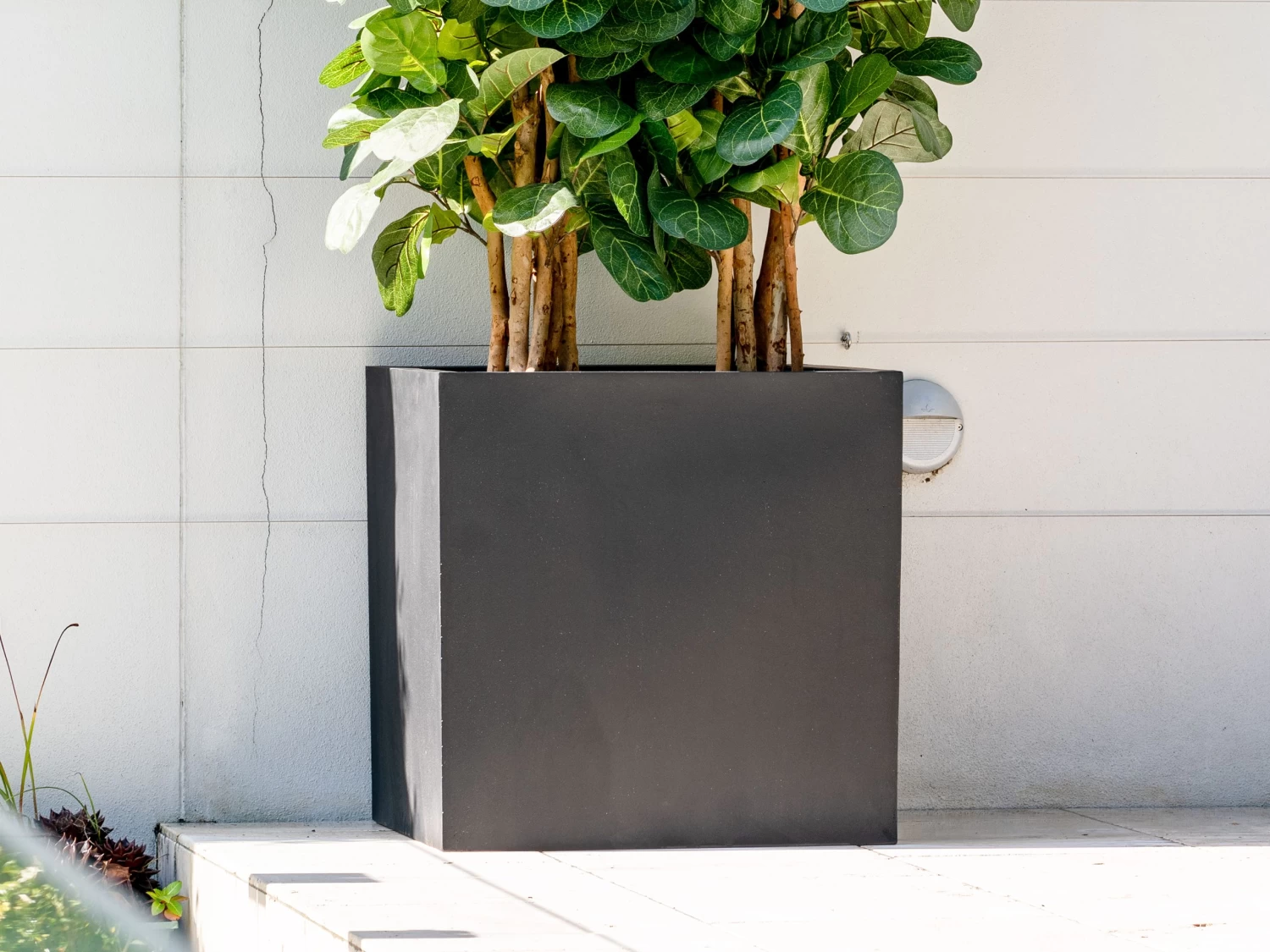 The Cubo cube style planter has a contemporary appearance with a clean-lined square silhouette and a sleek, black, stone-look finish.