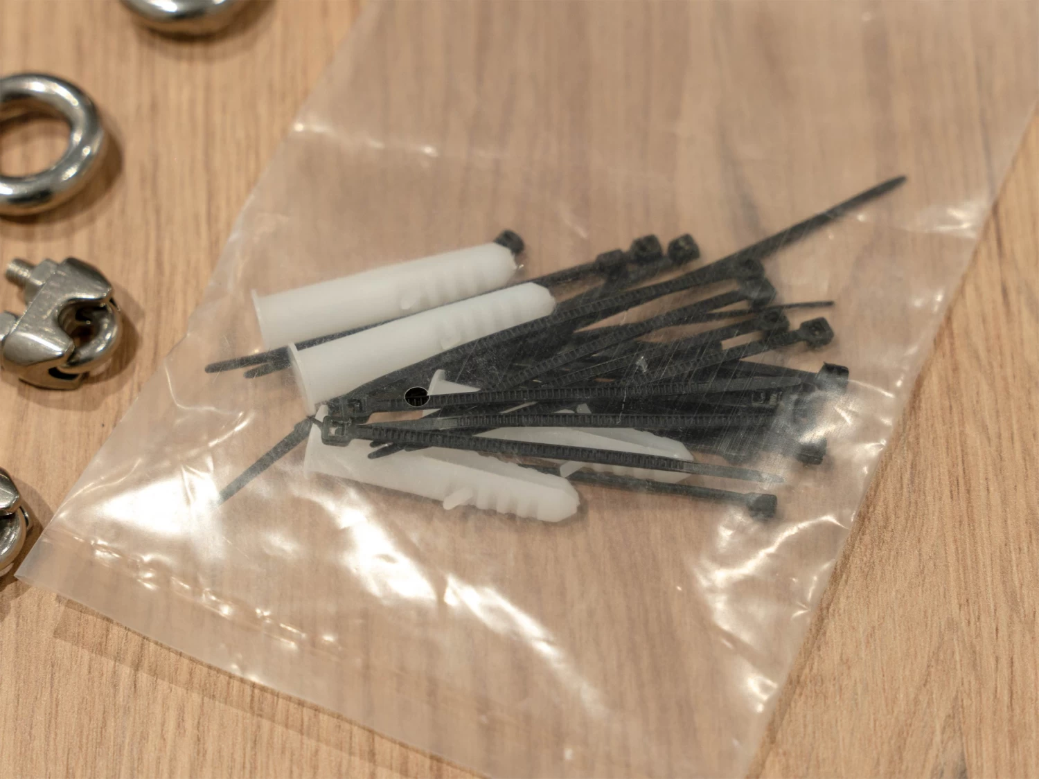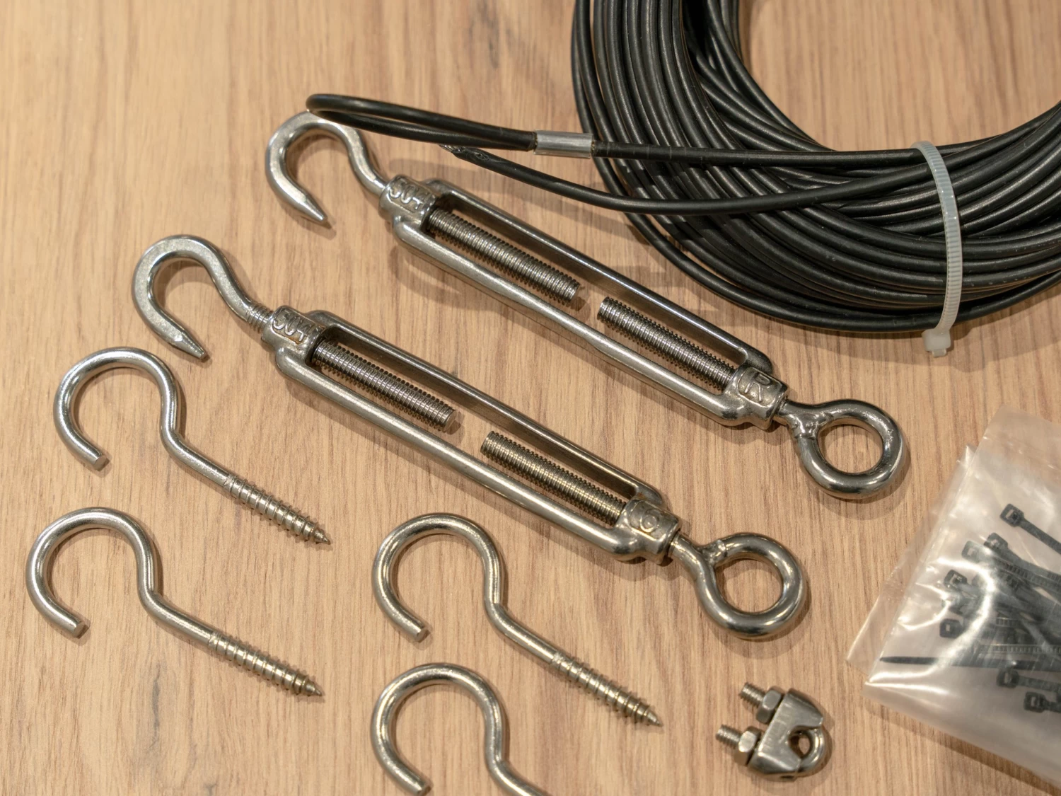 1 x 20M 1/8″ black plastic coated 304 stainless steel cable, 2 x 304 turnbuckle hooks, 4 x 304 wall anchors, 2 x 304 U-Bolt crimp, 4 x mounting hooks, 25 x black zip ties