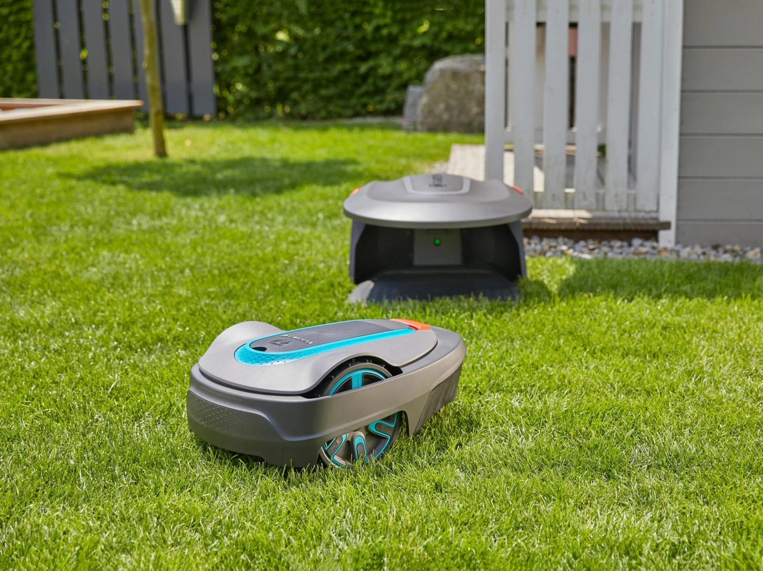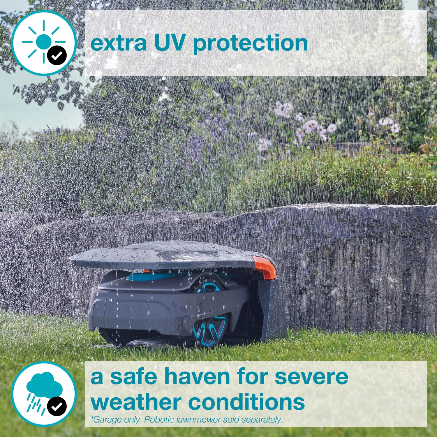 GARDENA SILENO Robotic Lawnmowers are hardy and weatherproof. For extra protection for the robotic lawnmower and charging station from direct sunlight, heavy rain and severe weather conditions, the robust plastic garage unit provides an ideal solution.
