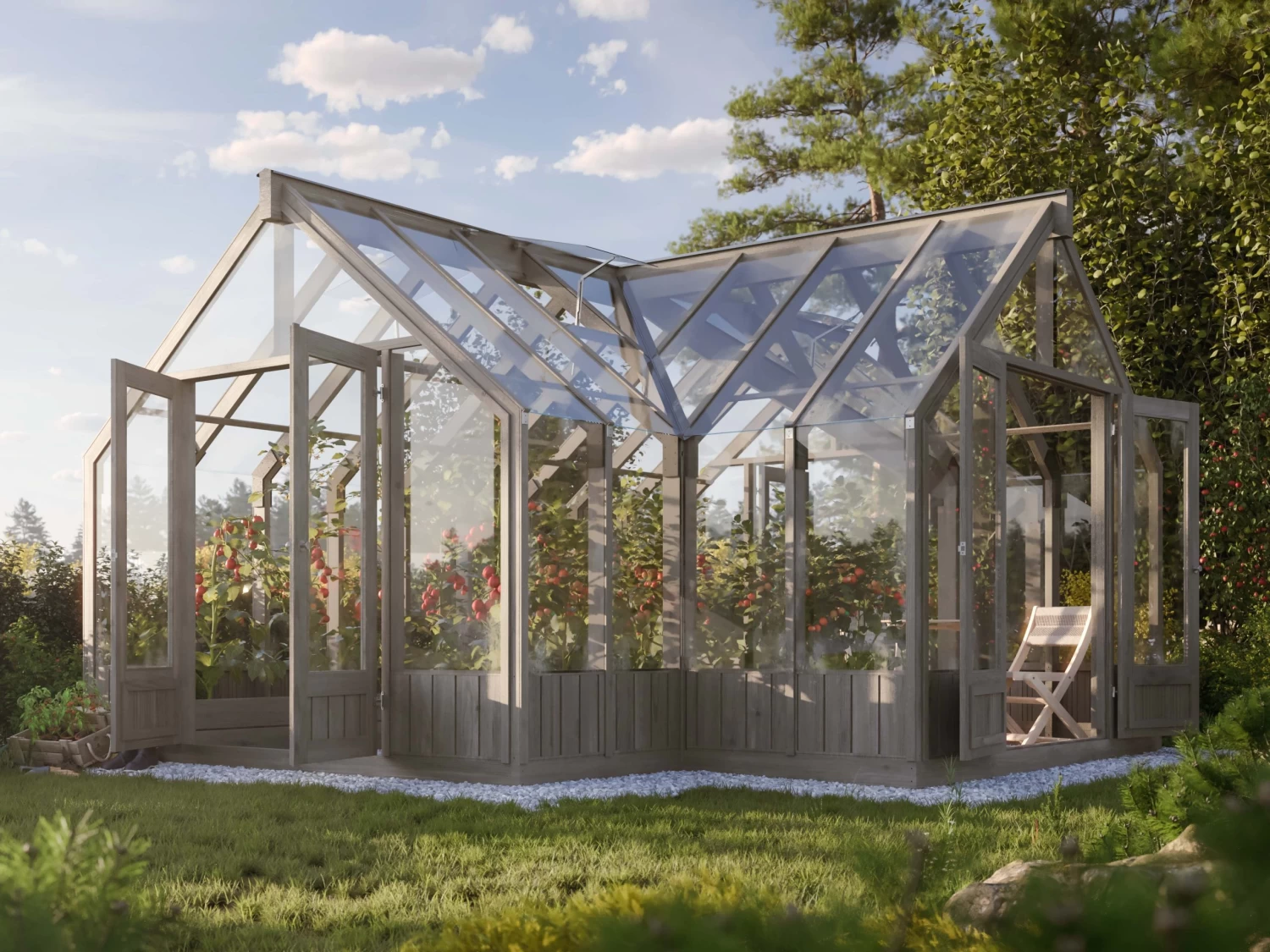 As the night draws in you’ll be able to pop down to your glasshouse to stargaze, protected from chill and draughts. The pitched roof of the Emilia gives the structure a traditional feel, whilst its glazed, real glass panels make it sleek & modern. With 3 double doors, you’ve got multiple entries and maximum airflow options.