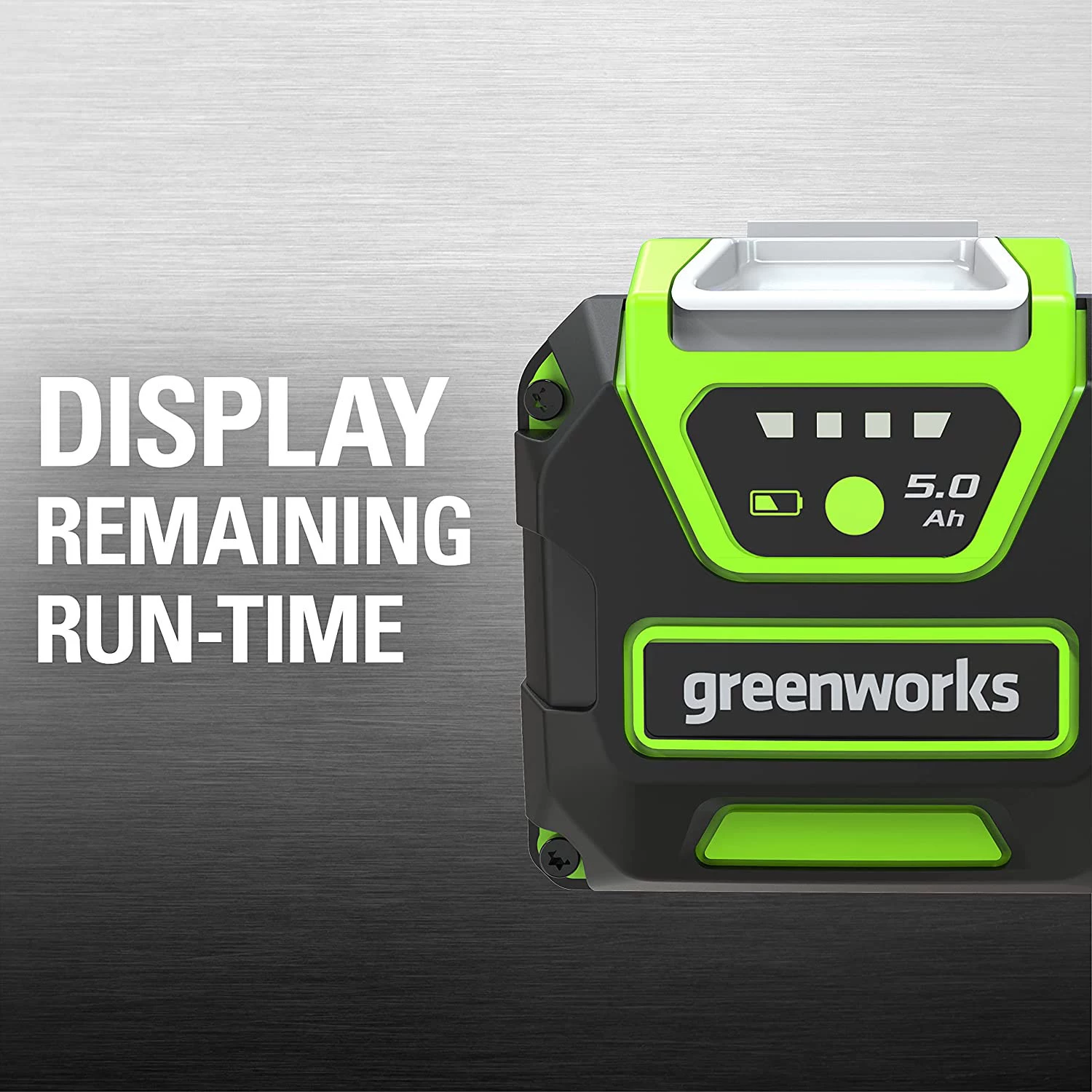 Powered by the included interchangeable G-MAX 40V Lithium-ion 5.0Ah Battery and 40V Battery Charger which delivers longer run time, higher performance and greater output on all Greenworks 40V tools.