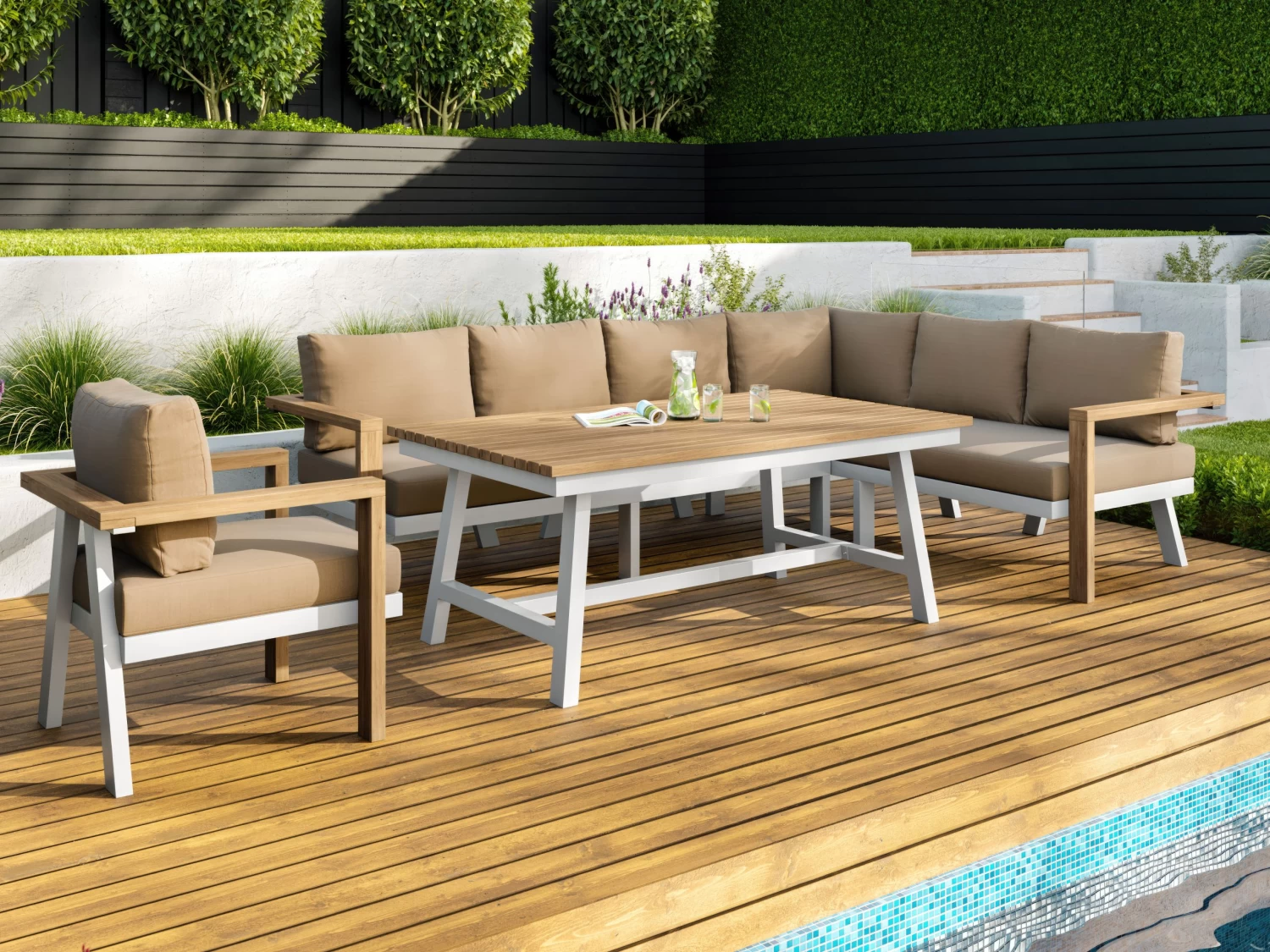 You will, of course, still be in your backyard, but it’s the thought that counts! This Havana sofa is constructed from a stylish combo of white & vintage teak Enviro imitation wood, enabling it to stand up to NZ weather conditions. The smooth Enviro wood tabletop is easy to keep clean, and the seats are complete with plush, water resistant seat cushions in an on-trend Sand Olefin fabric.