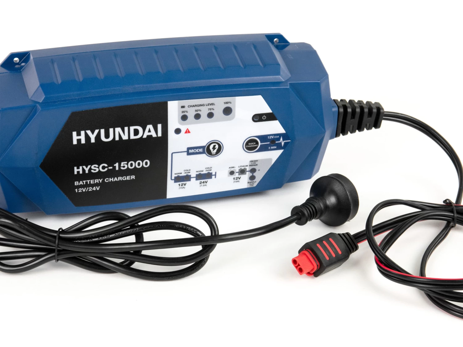 Keep all types of 12V and 24V lead acid batteries or 12V lithium batteries charged up and ready for action with this cutting edge smart charger from Hyundai.