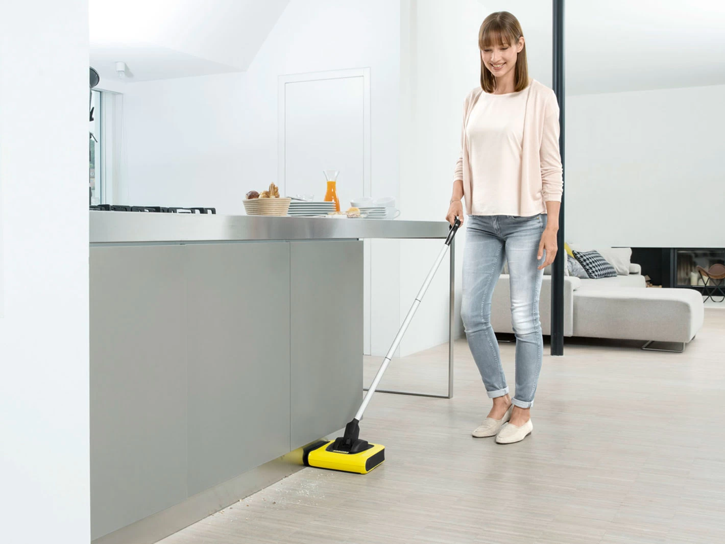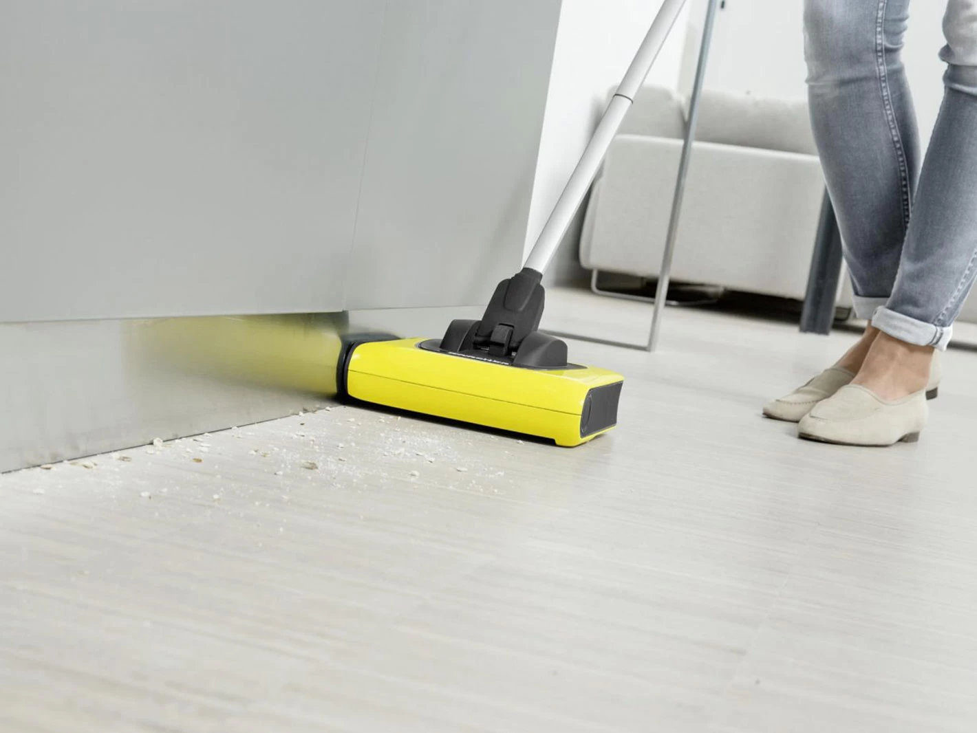 Fast and effective intermediate cleaning of hard floors and carpets? The perfect job for the KB 5 cordless electric broom. Thanks to the Kärcher Adaptive Cleaning System, the cordless electric broom delivers outstanding cleaning results and removes dirt easily and fully. The KB 5, which runs on a lithium-ion battery, is ready to use more quickly than a vacuum cleaner and makes intermediate cleaning extremely convenient: it allows you to work ergonomically without bending over, sweeps very close to the edge, reaches even between chairs and under furniture and can also be used comfortably on steps.