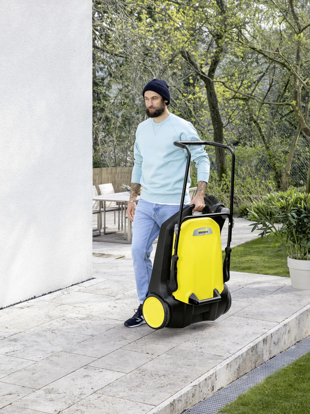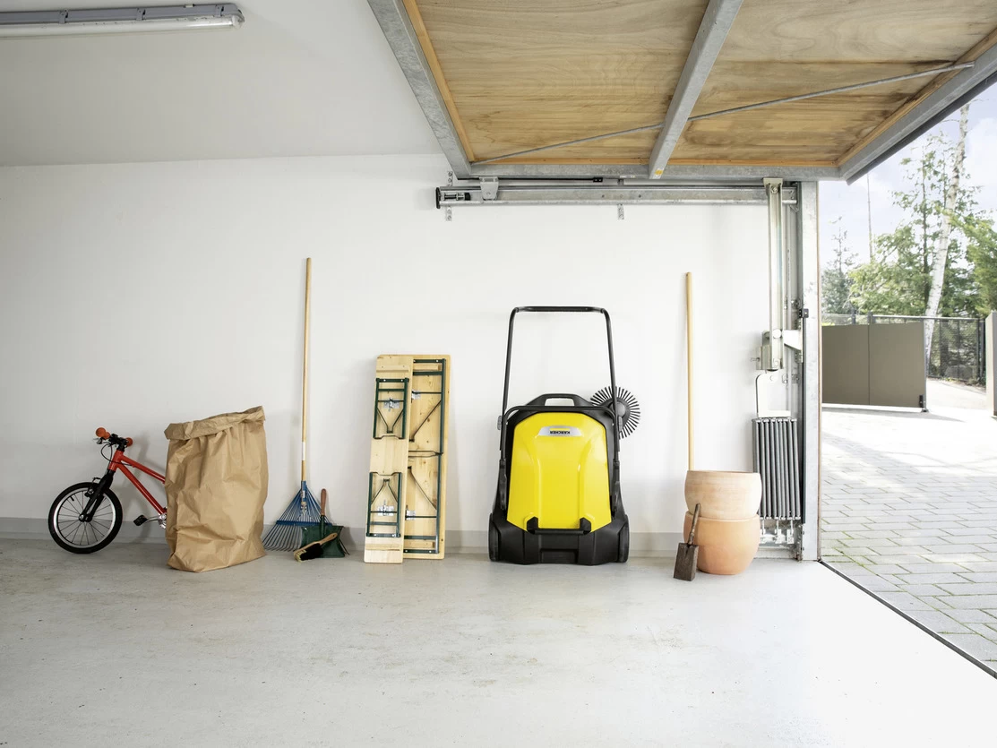 Whether it is spring, summer, autumn or winter – the new S 6 sweeper from Kärcher is suitable for year-round cleaning around the home and garden. Super effective thanks to its powerful roller brush, side brush and a sweeping width of 670 mm in total, it effortlessly sweeps areas of up to 2500 m² in an hour. It is also ergonomic with a 2 position push handle you can adjust on the fly. And it’s clean, the waste lands directly in the 38 litre waste hopper which means no dirty hands when emptying.