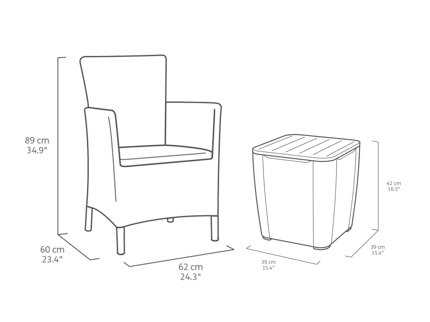 Dimensions: Chairs H89cm x W60cm x D62cm, Side Table H43cm x W39cm x D39cm