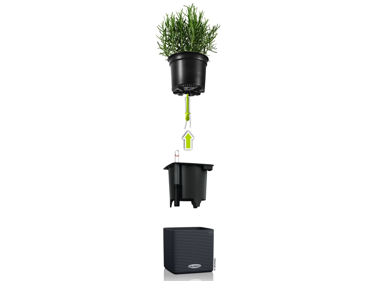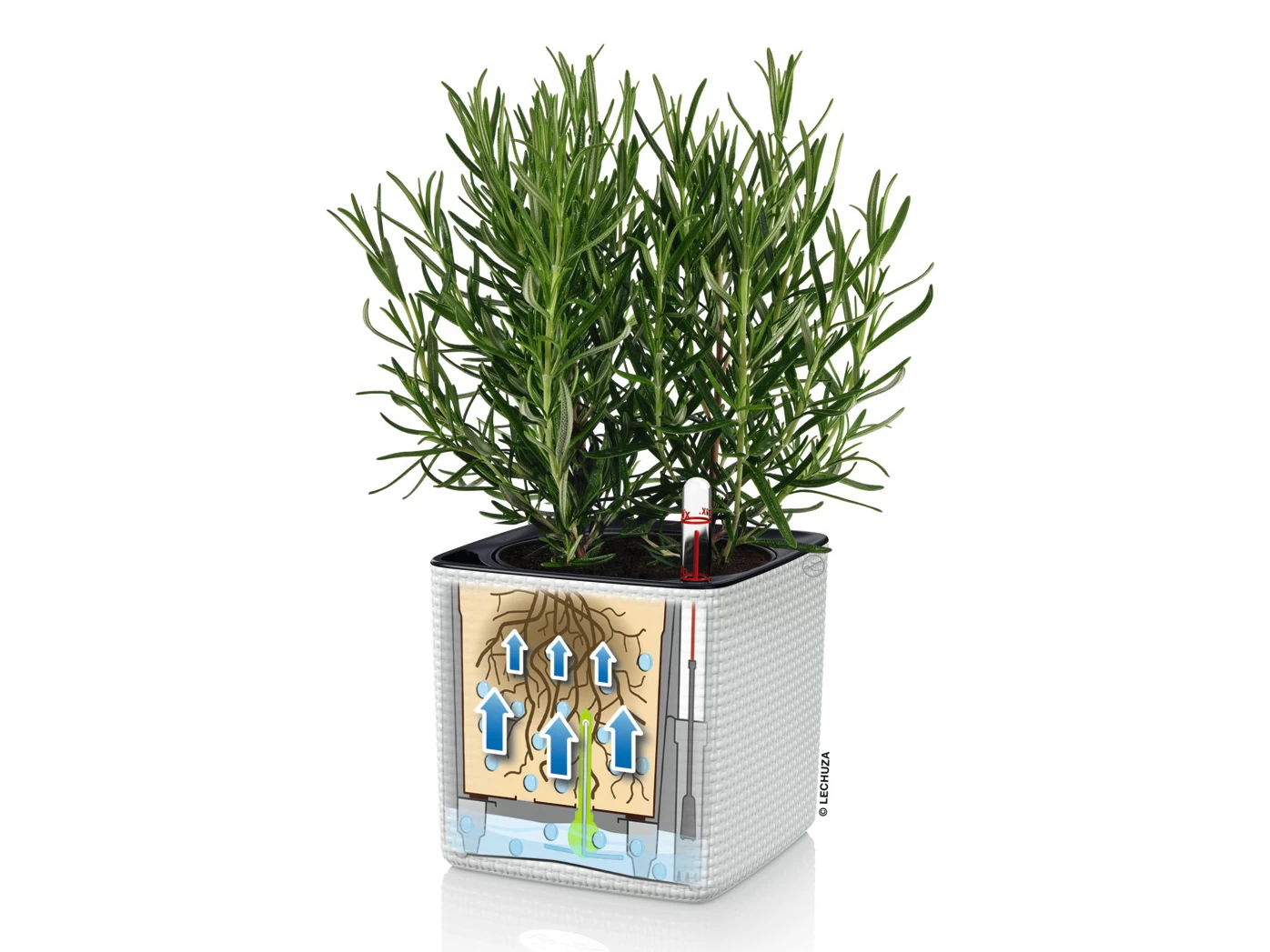 The herbs do not even have to be repotted because the LECHUZA sub-irrigation system reliably supplies the herbs in the grow pot with moisture; simply insert the stick into the herb pot from below, place it in the CUBE Color and pour. Done!