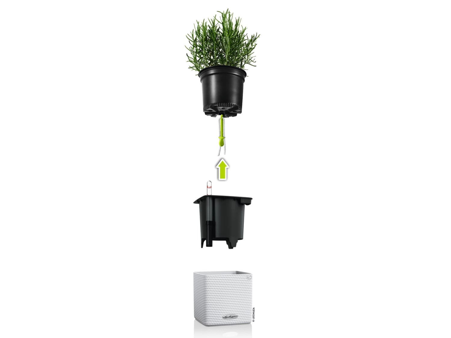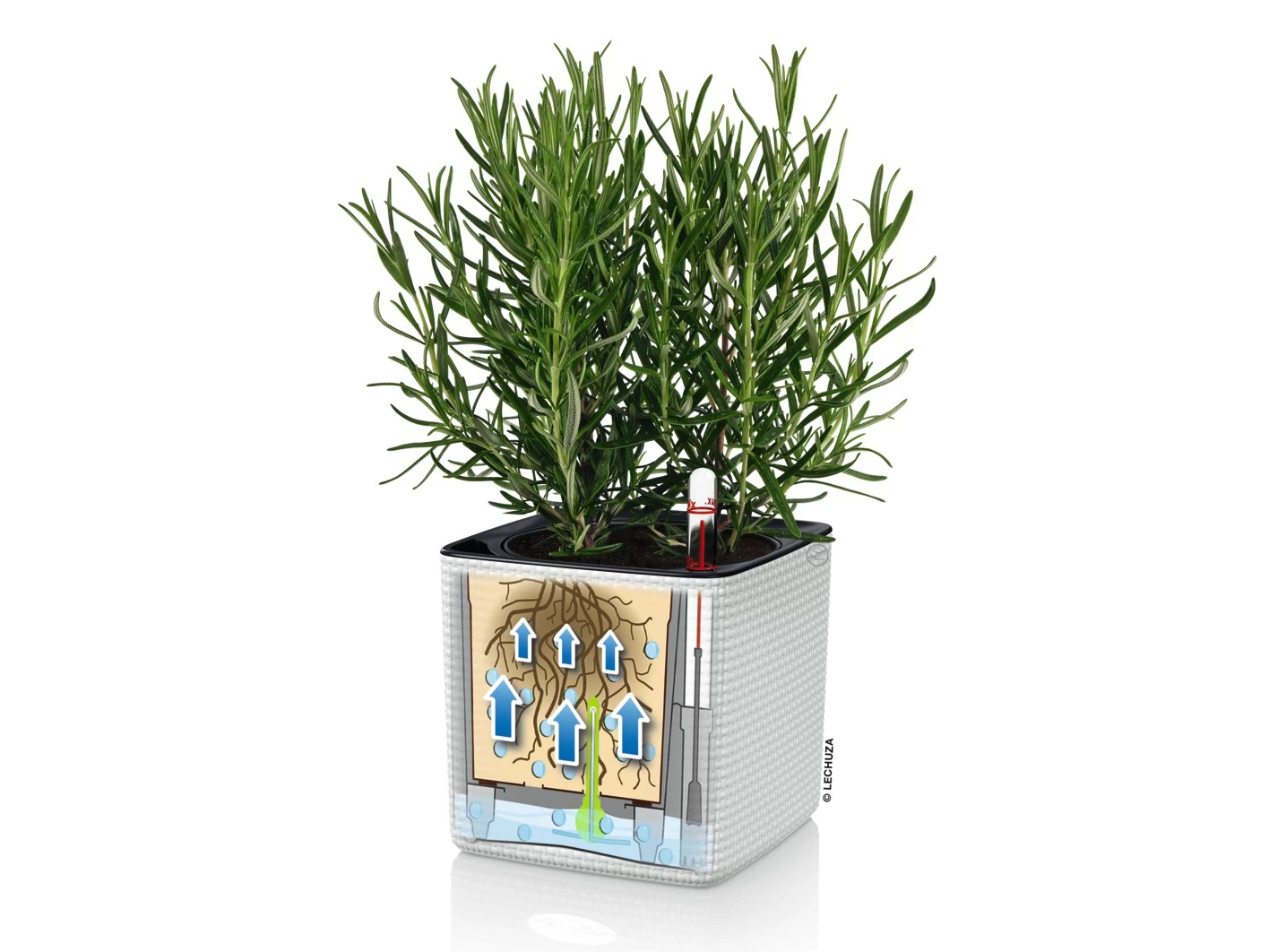 The herbs do not even have to be repotted because the LECHUZA sub-irrigation system reliably supplies the herbs in the grow pot with moisture; simply insert the stick into the herb pot from below, place it in the CUBE Color and pour. Done!