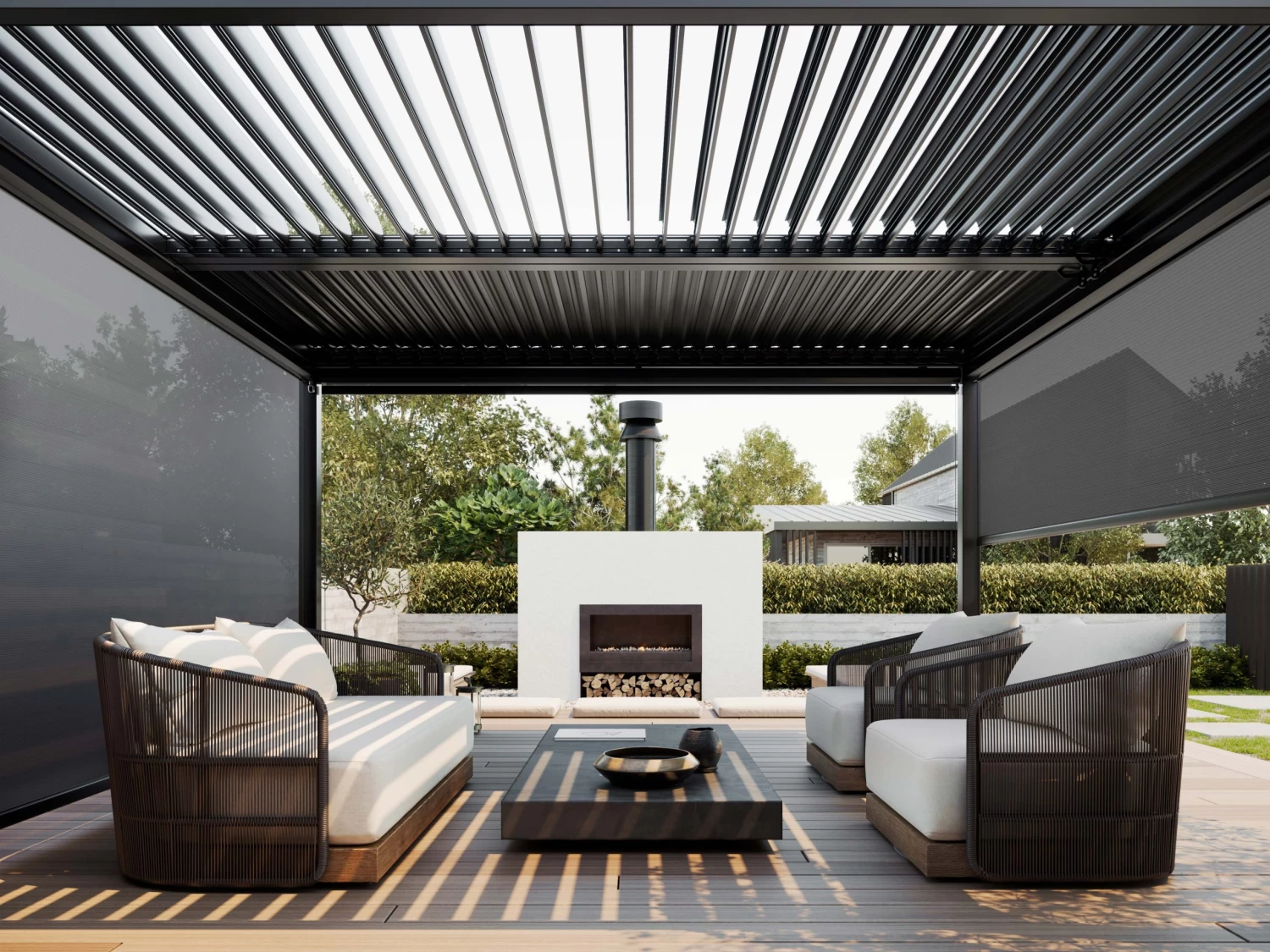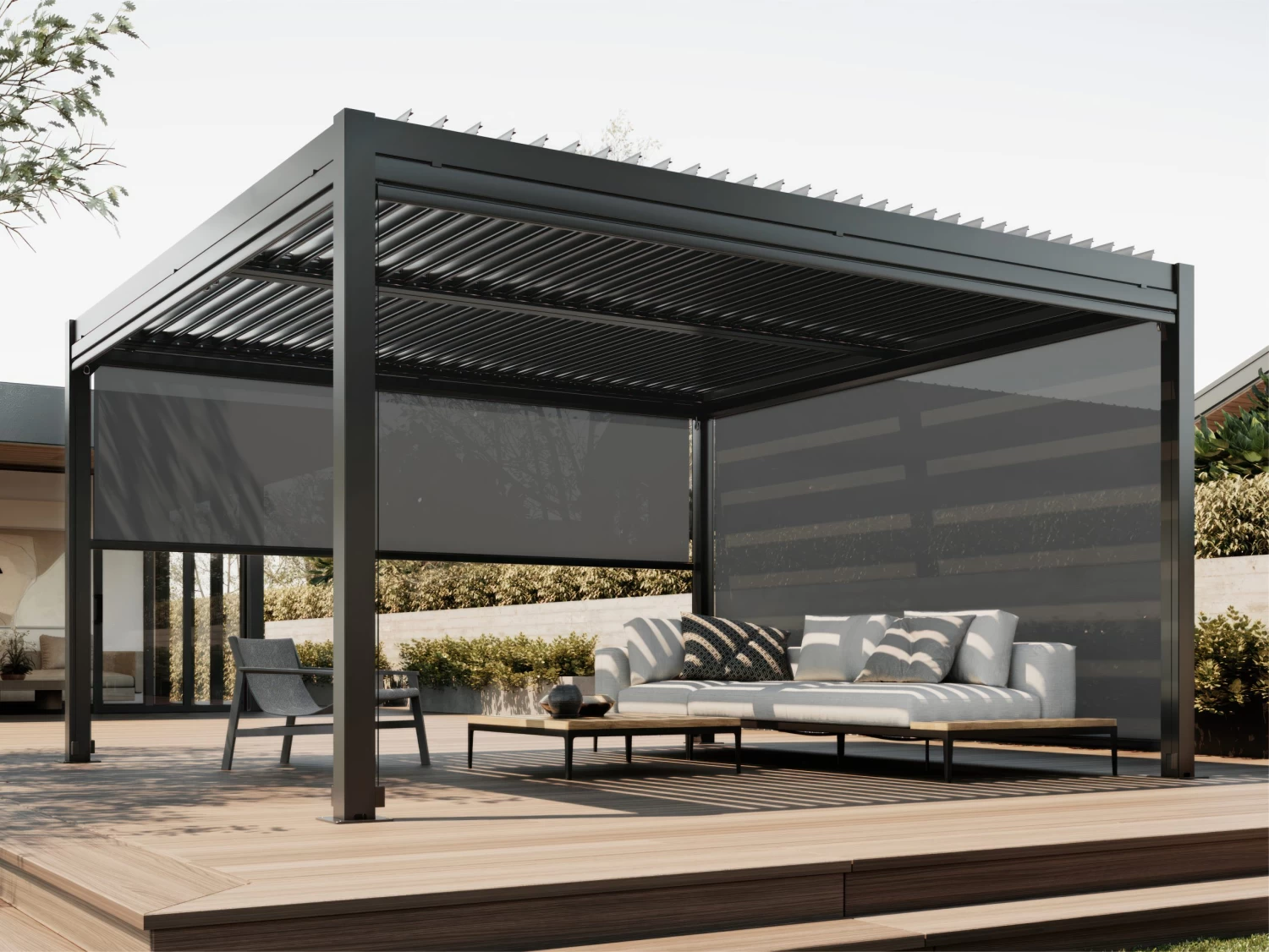 Complete your outdoor living room with this sleek 3.7m mesh roller blind for 4m sides on our Louvre Roof Systems.