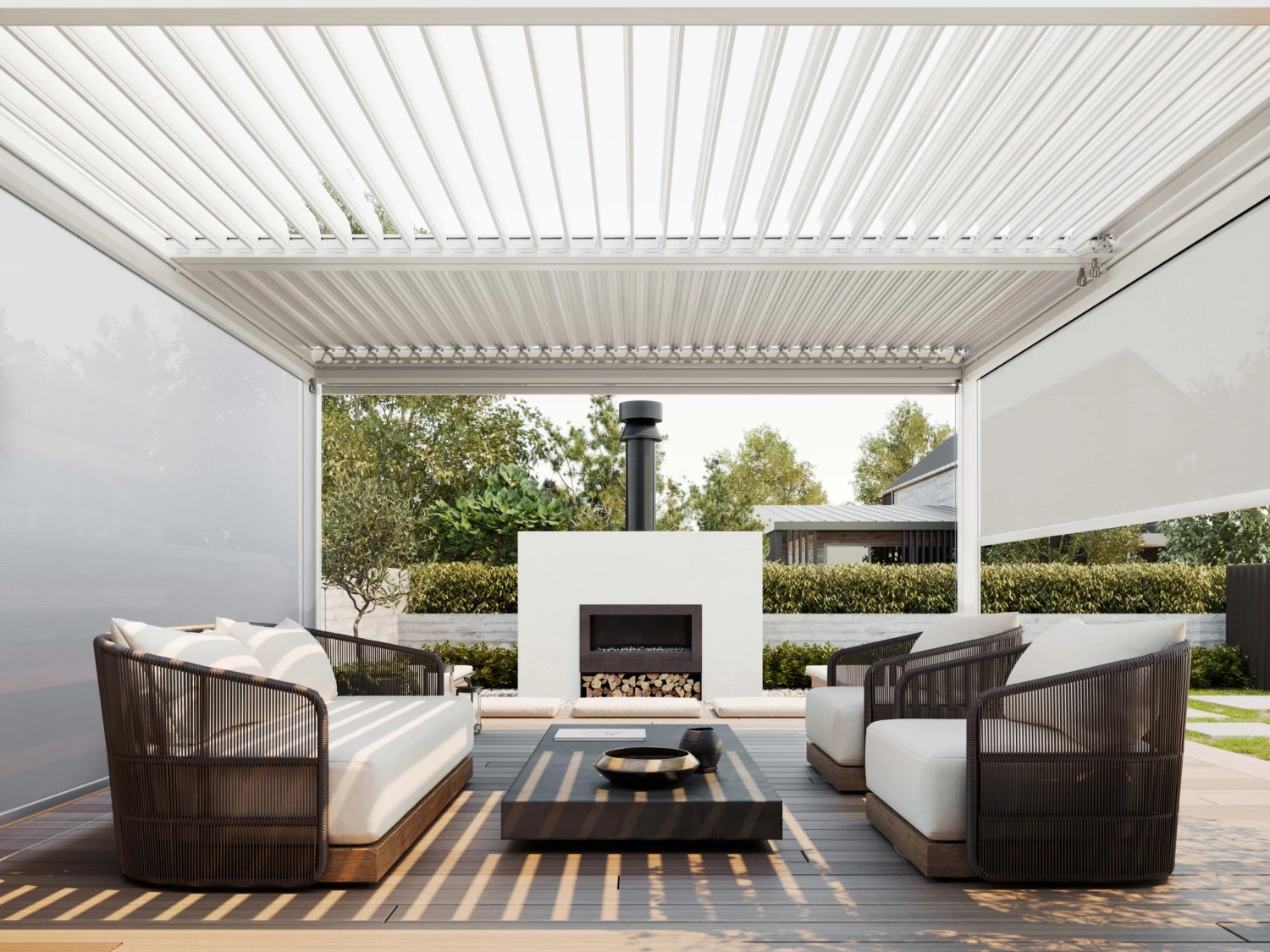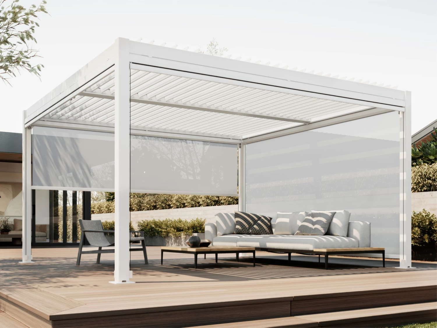Complete your outdoor living room with this sleek 3.7m mesh roller blind for 4m sides on our Louvre Roof Systems.