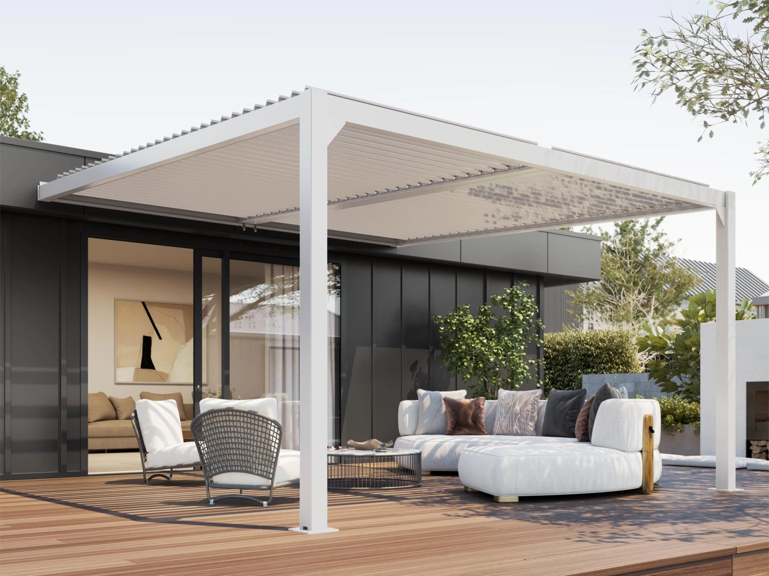 The integrated crank system allows you to easily and smoothly open or adjust the louvres. Open it right up and enjoy that perfect Kiwi summers day or keep it closed when the weather is changeable – the integrated gutters and internal downpipes make this roof system truly all-weather.