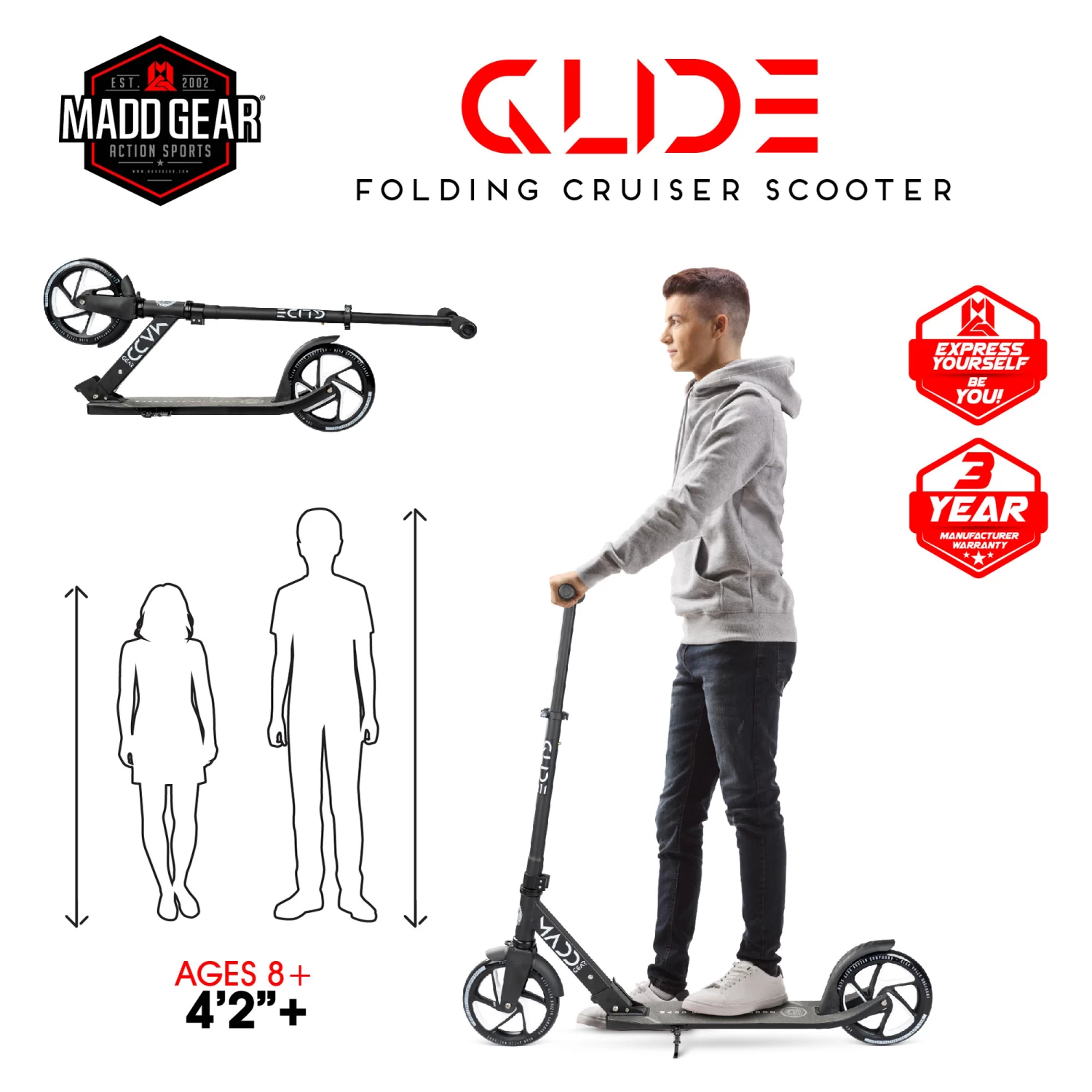 The Madd Gear Renegade 200 Scooter is the ultimate commuter or cruiser! With large 200mm smooth rolling wheels for a comfortable ride, you’ll be rolling in style on the way to school, work or just around the block trying to keep up with the kids!