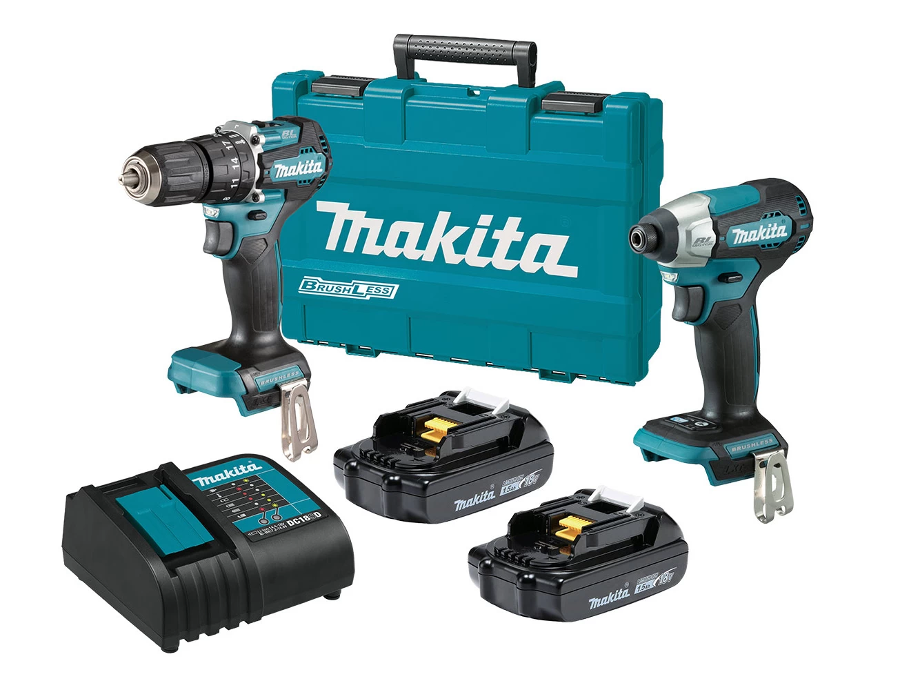 Includes: DHP487 Cordless Brushless Hammer Drill Driver, DTD157 Cordless Brushless Impact Driver, 2 x 1.5Ah batteries (BL1815N), charger (DC18SD), carry case (821599-0).