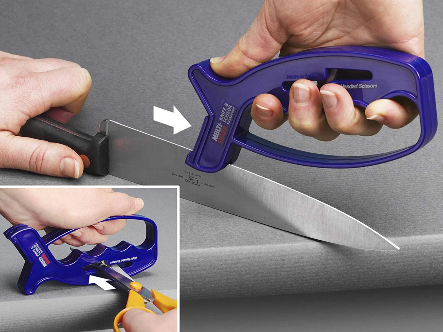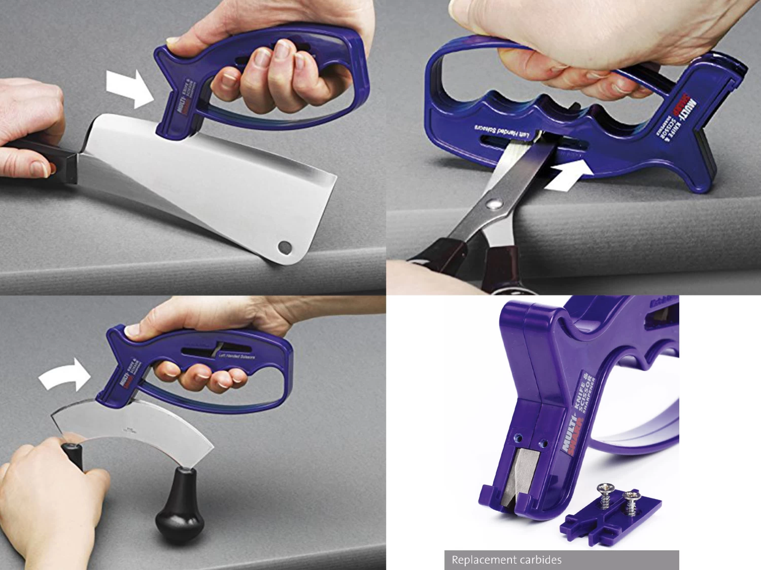 This multi-purpose sharpener is ideal for re-sharpening scissors, knives, cleavers, choppers and mezzalunas.