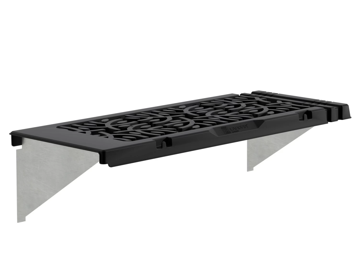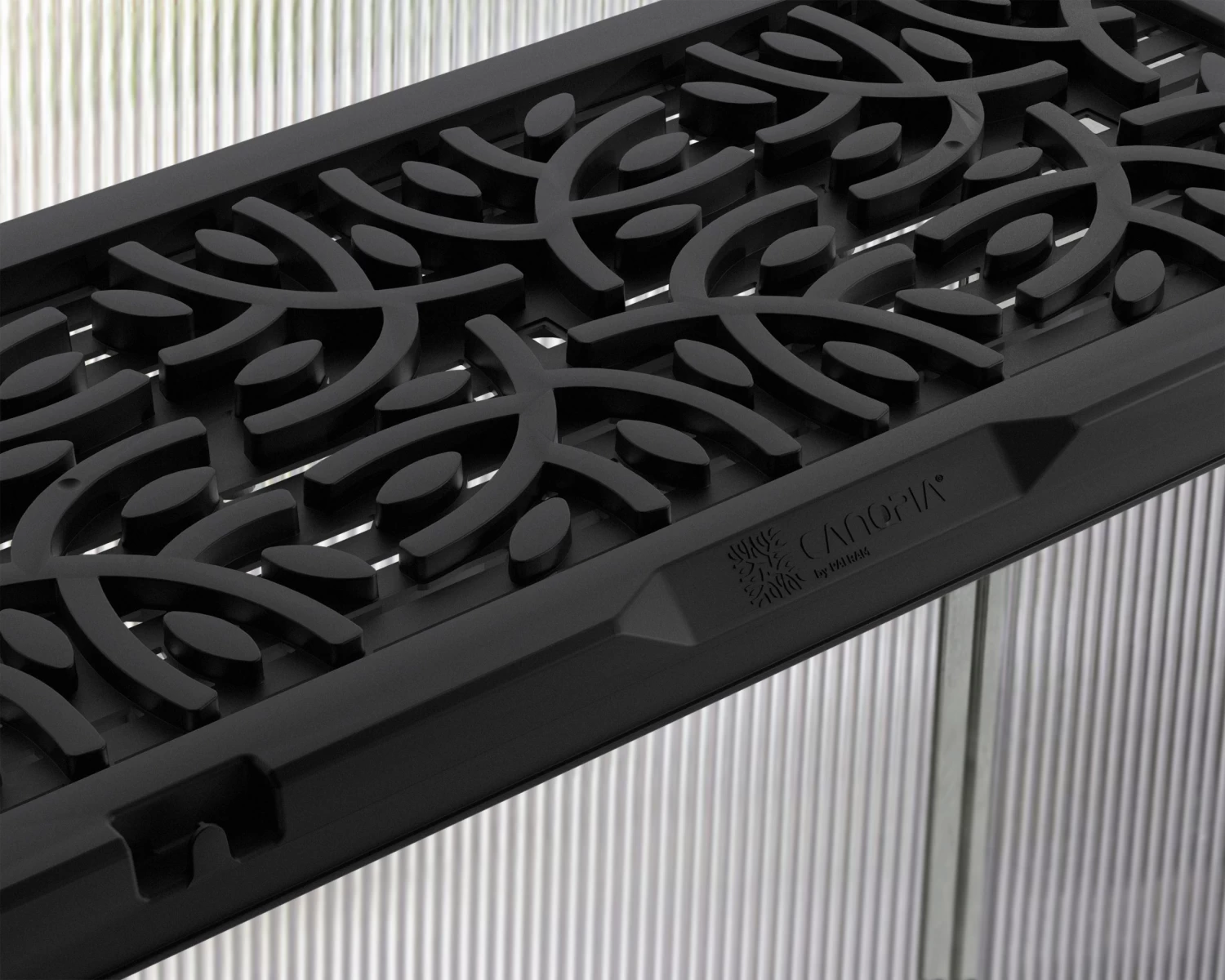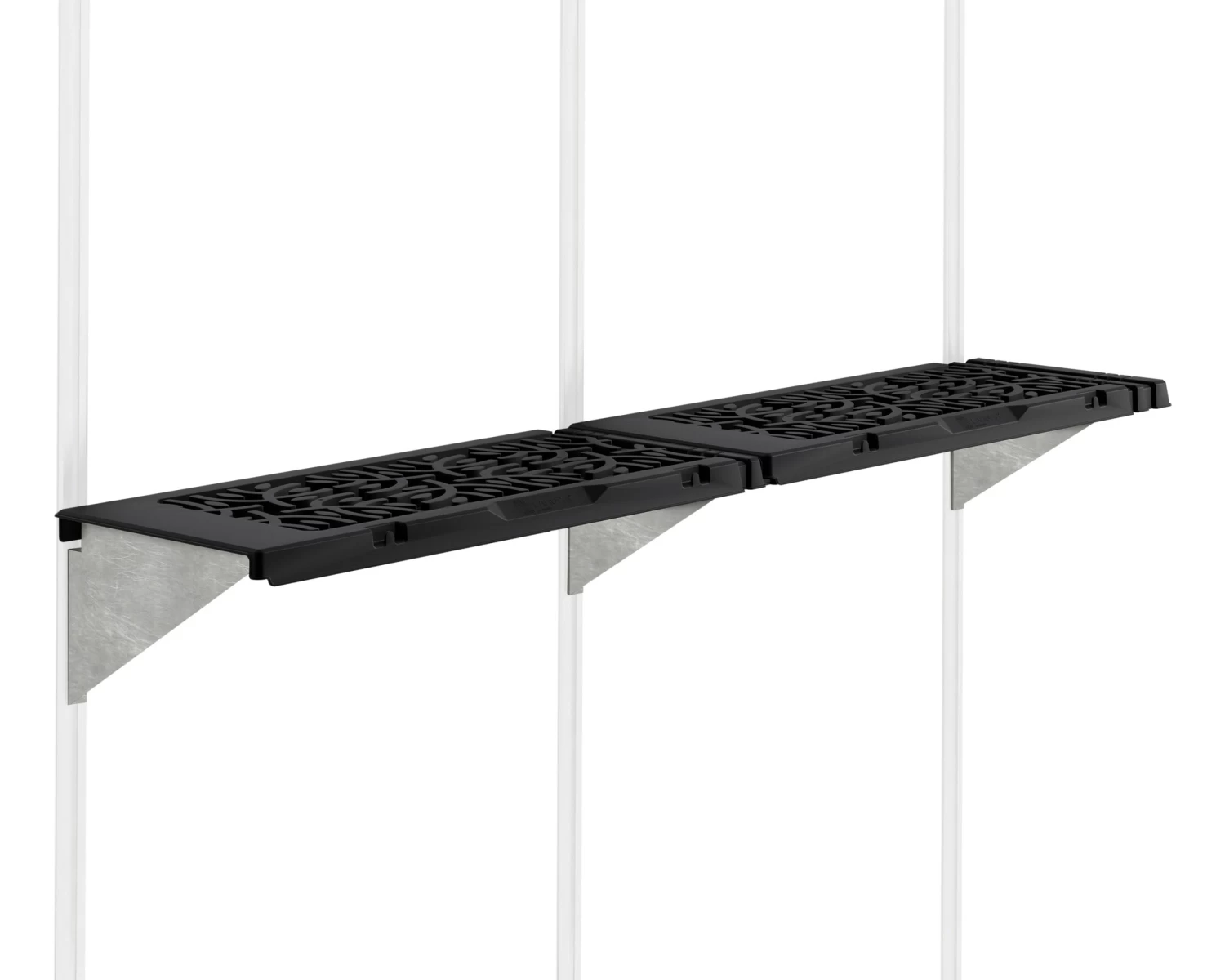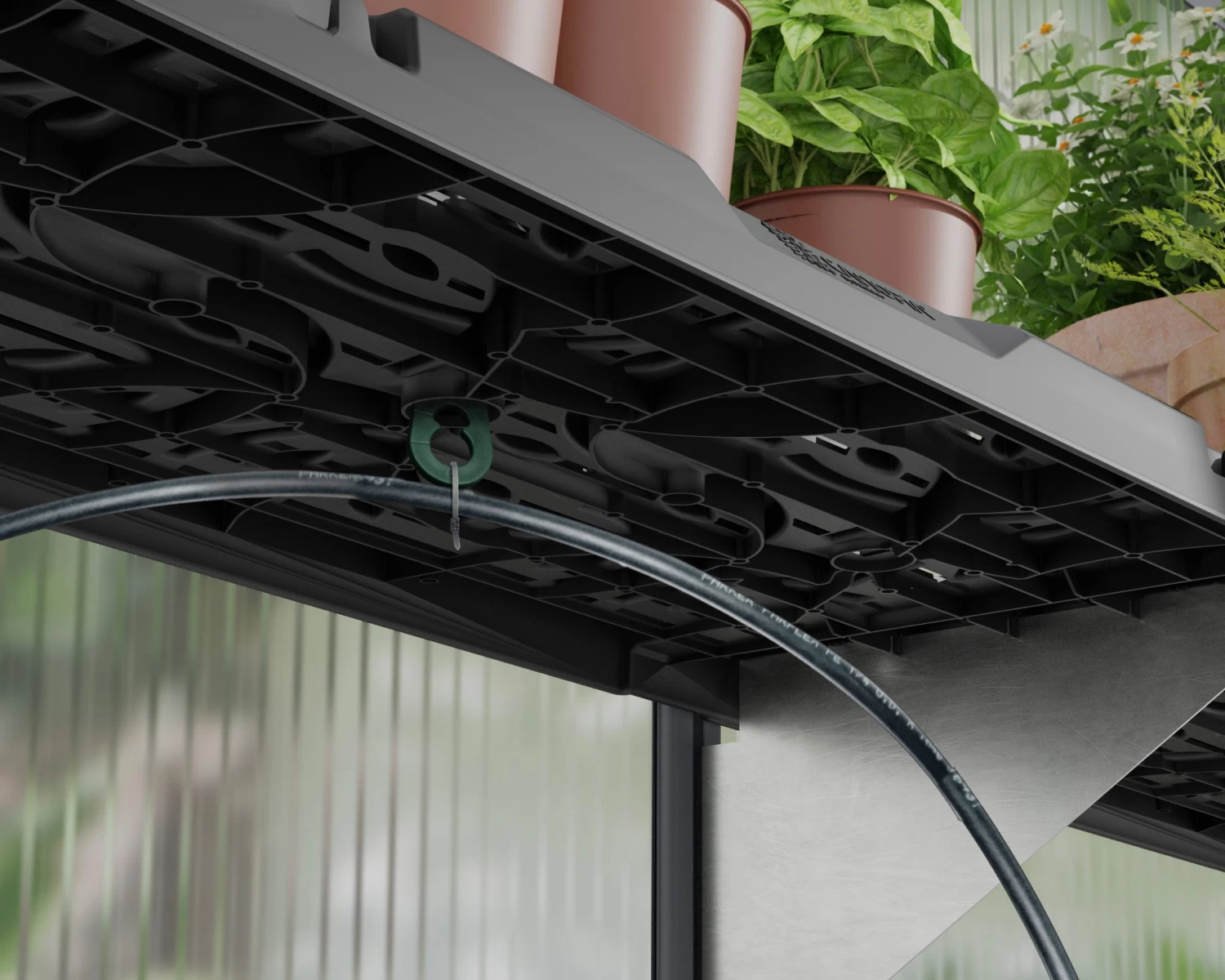 These shelves clamp to the greenhouse frame and can be easily adjusted or dismounted so you can hose down any excess plant, soil, and water remnants that collect in the underlying channels.
