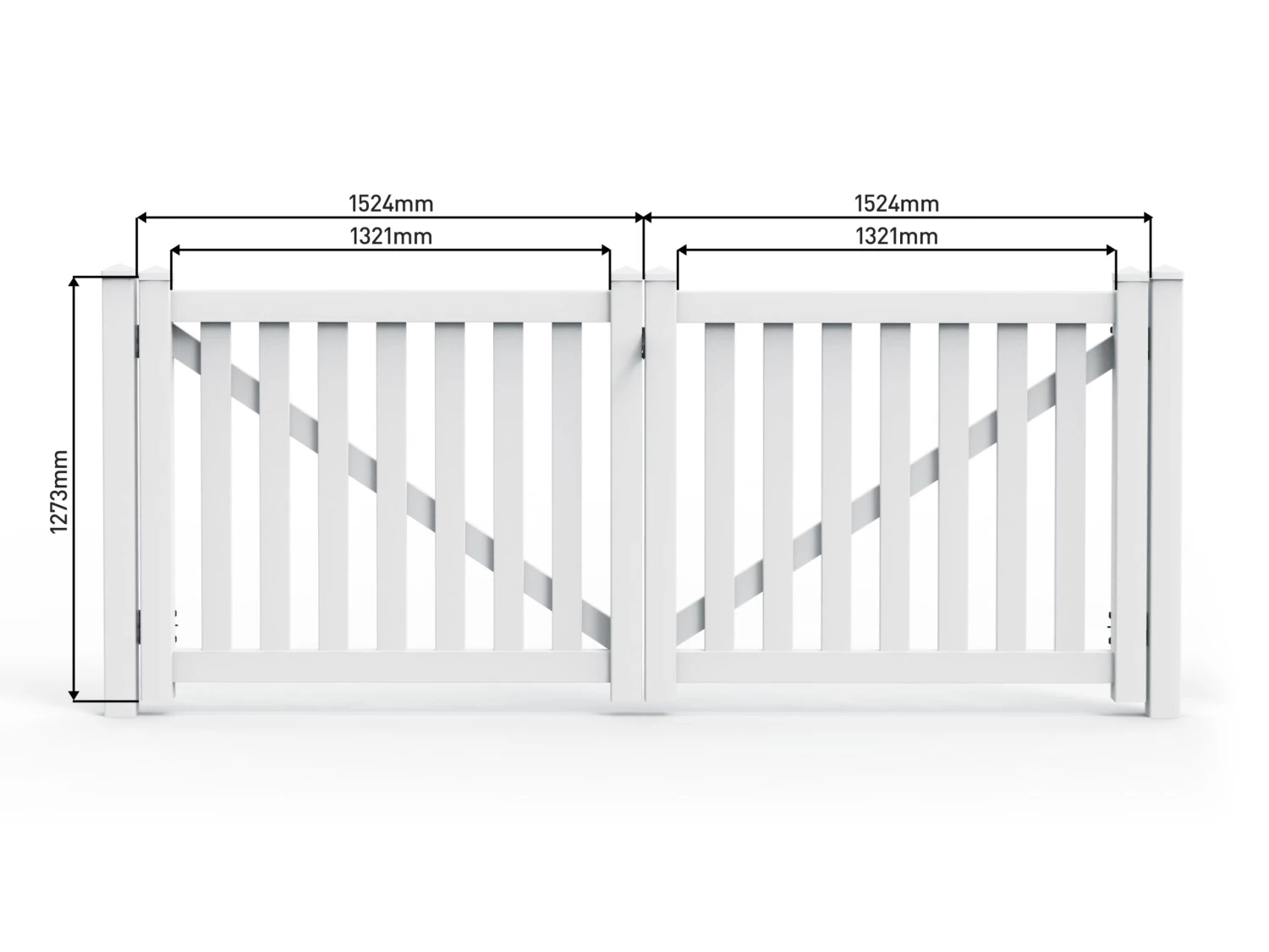 Picket Driveway Gate Kit includes: 1 x Double Gate, 2 x pairs of Hinges, 1 x Latch, 1 x Drop Bolt, 2 x Posts, 2 x Alloy Inserts (for gate posts), 2 x Post Caps.