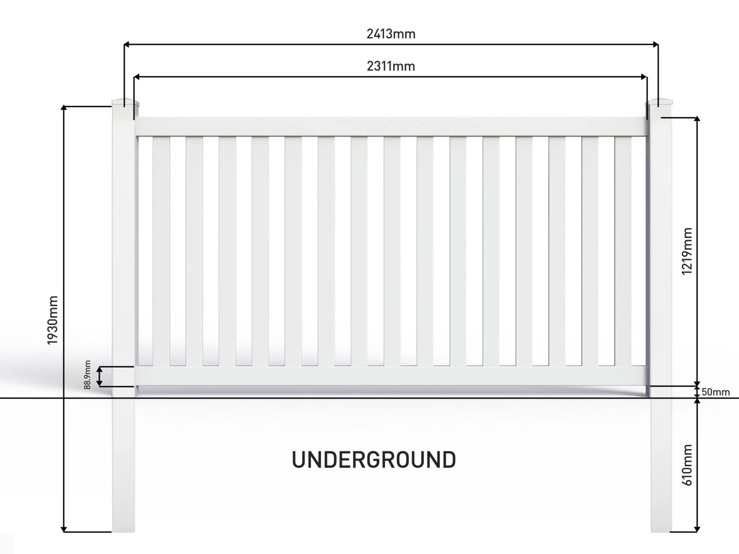 Top rail size: W 2388mm x D 50.8mm x H 88.9mm (PVC thickness 2.8mm)