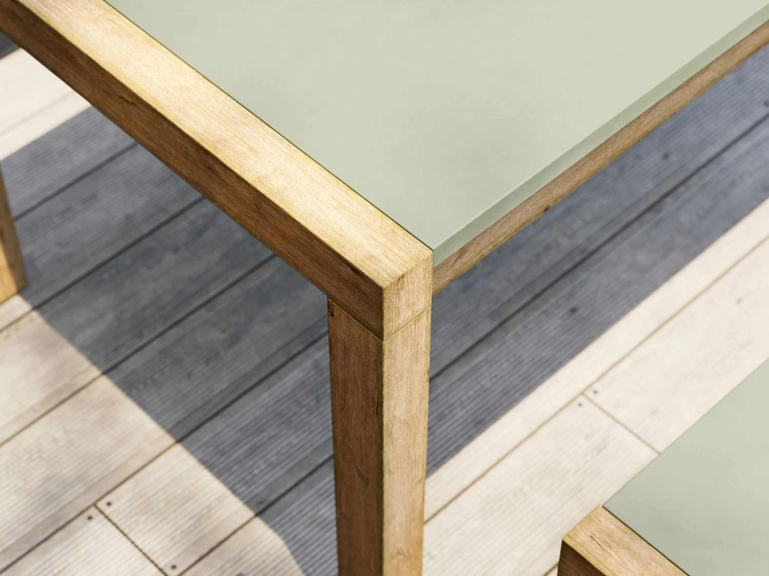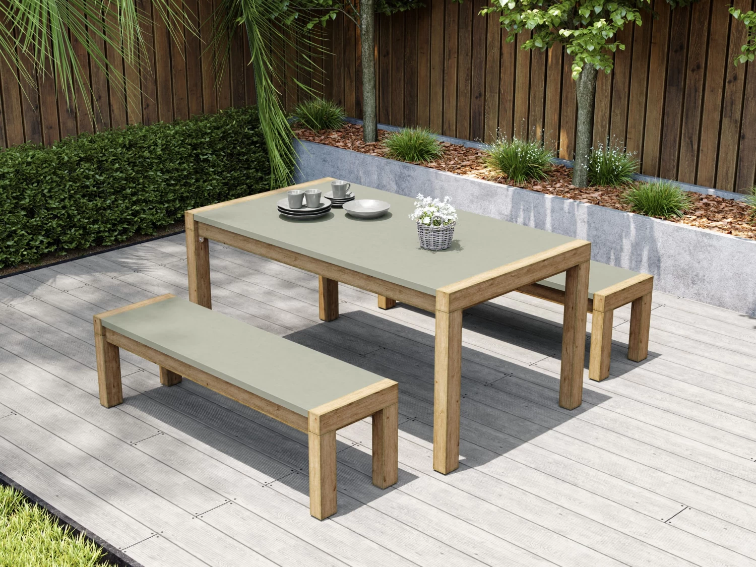 The legs and framing use quality acacia wood, which not only looks great but is a durable, weather resistant material. The natural wood combines perfectly with the sharp textured look of the lightweight reinforced concrete table top for a functional, stylish set that can stand up to Kiwi conditions.