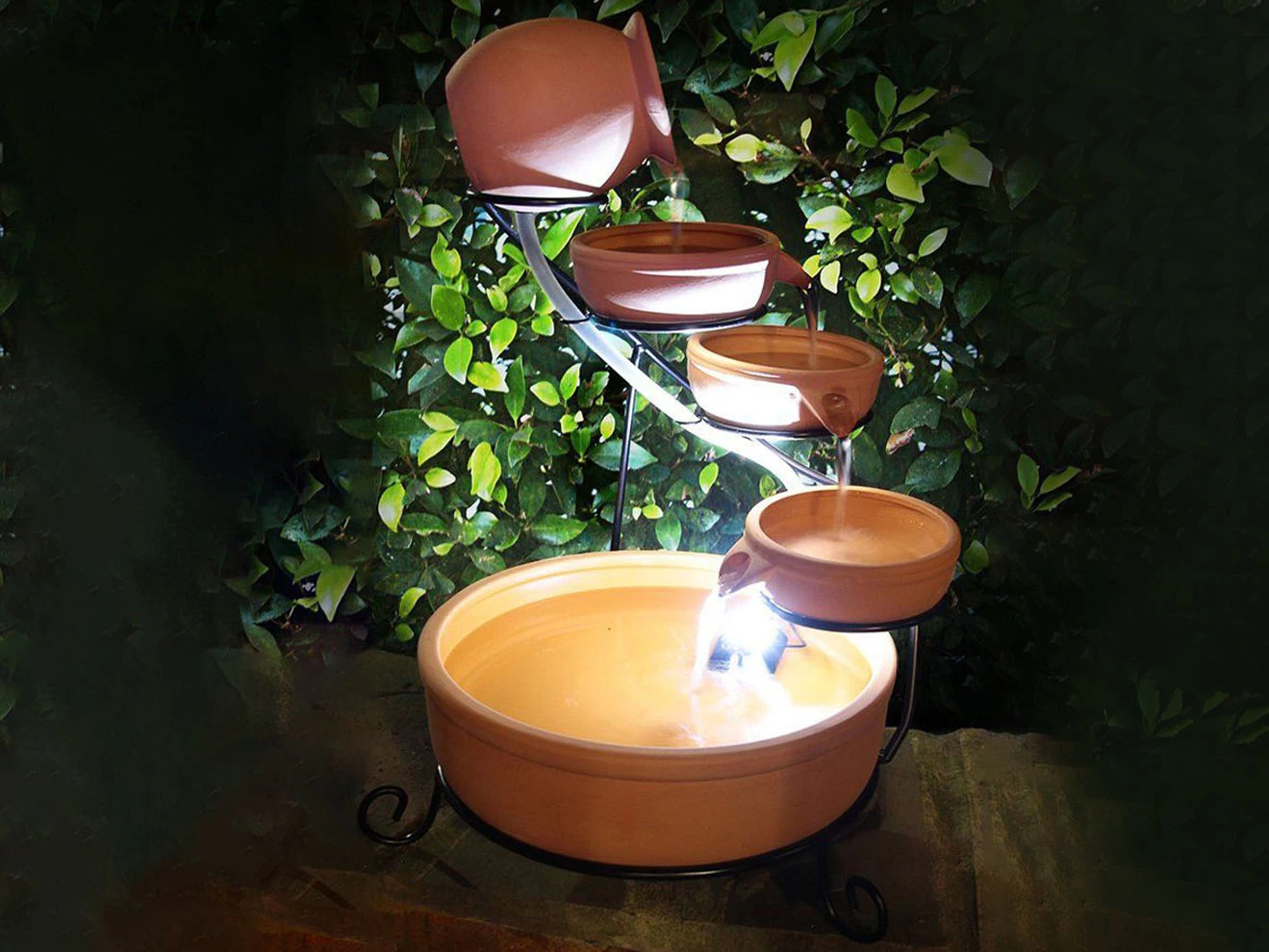 Lightweight and allowing for easy portability, this stylish fountain consists of a base pot, three dish levels, and a top pot on an iron rack.