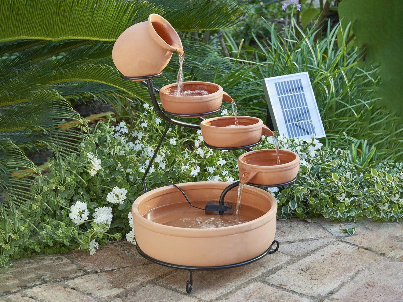Powered by a solar panel and pump, this fountain is totally self-contained and requires no wiring, digging or additional reservoir. Water is pumped up to the top pot and cascades down through the water feature before collecting at the base, ready to complete the cycle again.