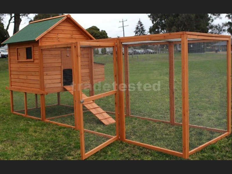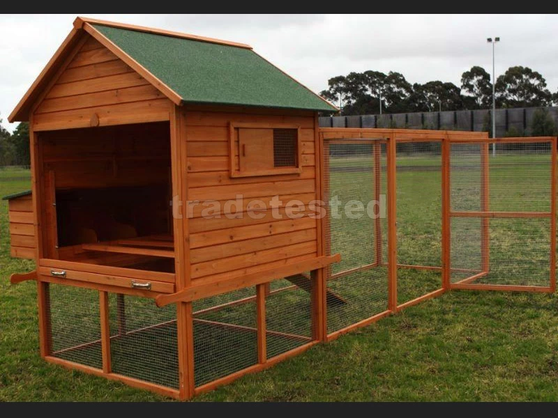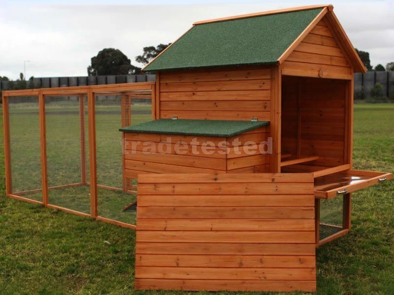 This is a deluxe model made of solid wood. It has an elevated sleeping area and ridged ramp for your chooks to scuttle up to their perch. Mini windows let light into the coop. The separate nesting area has a lift-up roof, allowing you to collect eggs easily. The run is tall enough for you to crouch inside for maintenance and cleaning.