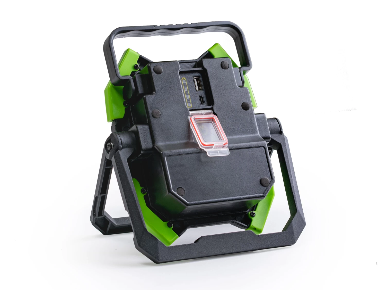 This LED work light features an integrated floor stand that can be folded up to use as a handle to move your light wherever needed, putting out plenty of ultra-white bright light.