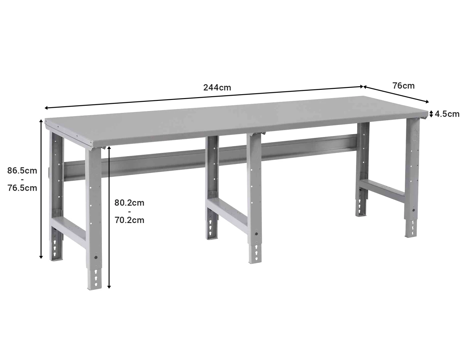 Benches are made with steel channel construction for long-lasting durability. For stability and reinforcement, the 2.4 metre long bench is supported by 3 leg frames. You can adjust the height from 76.5cm to 86.5cm. Legs are finished with scratch resistant grey baked enamel.